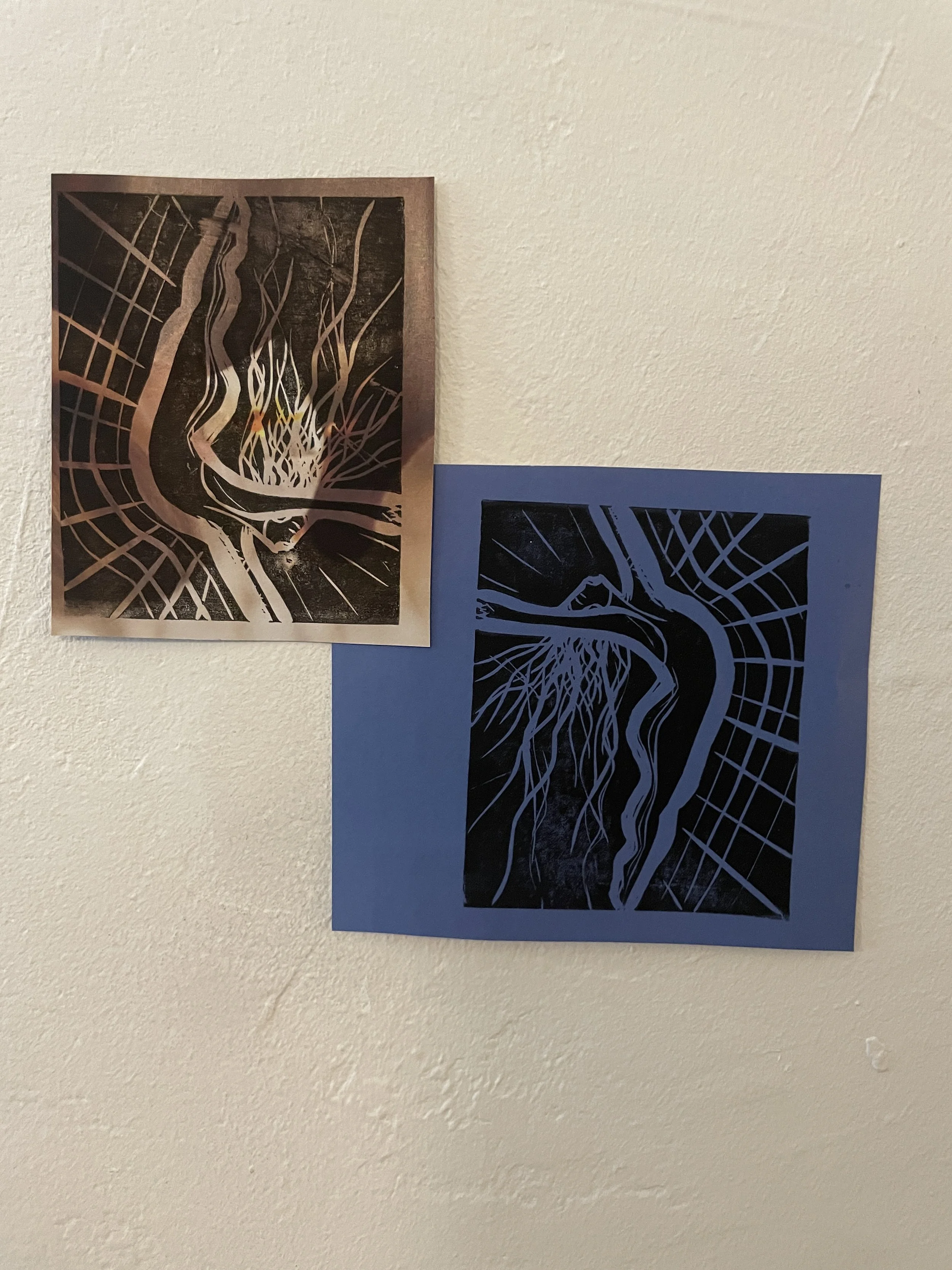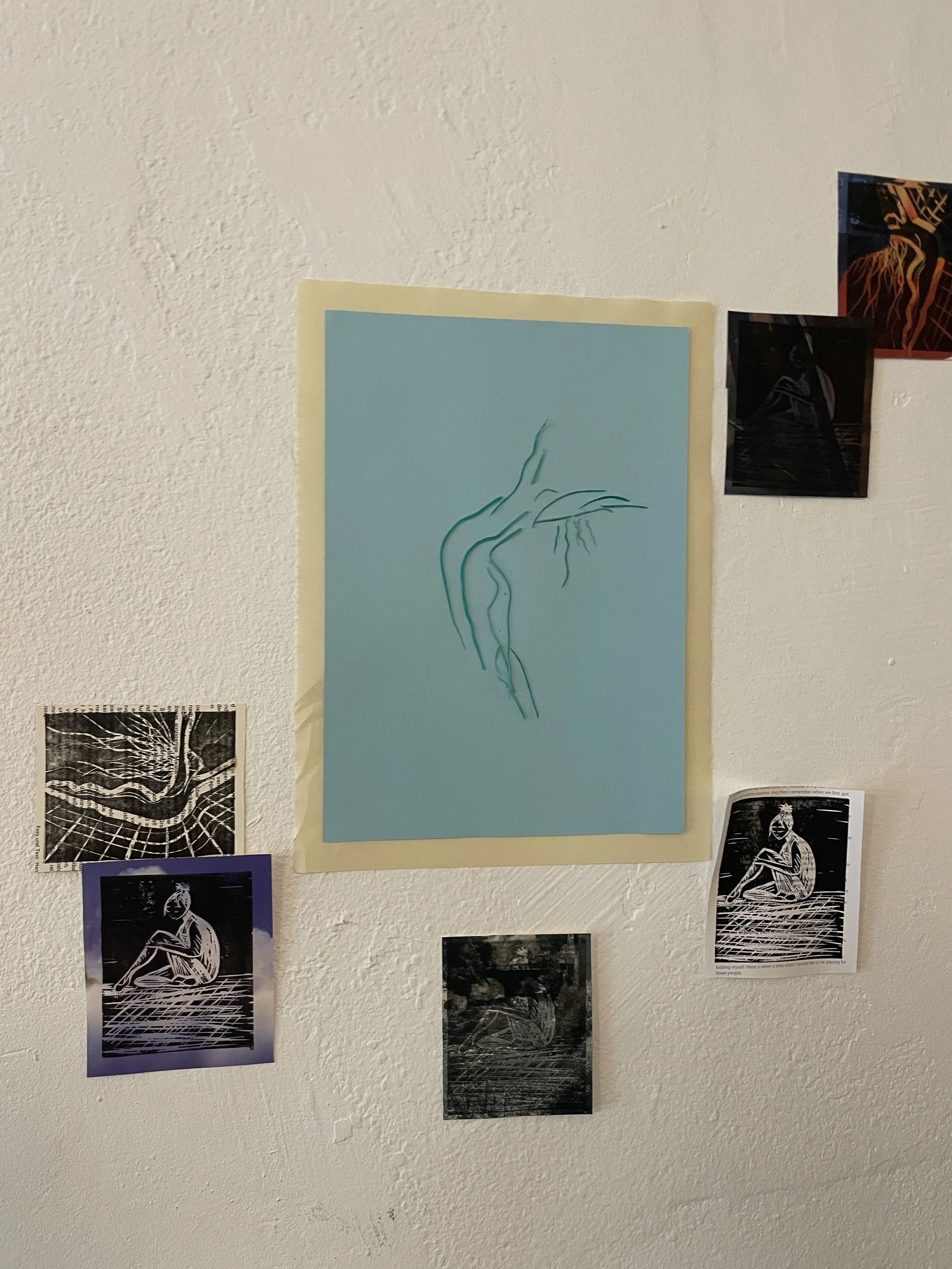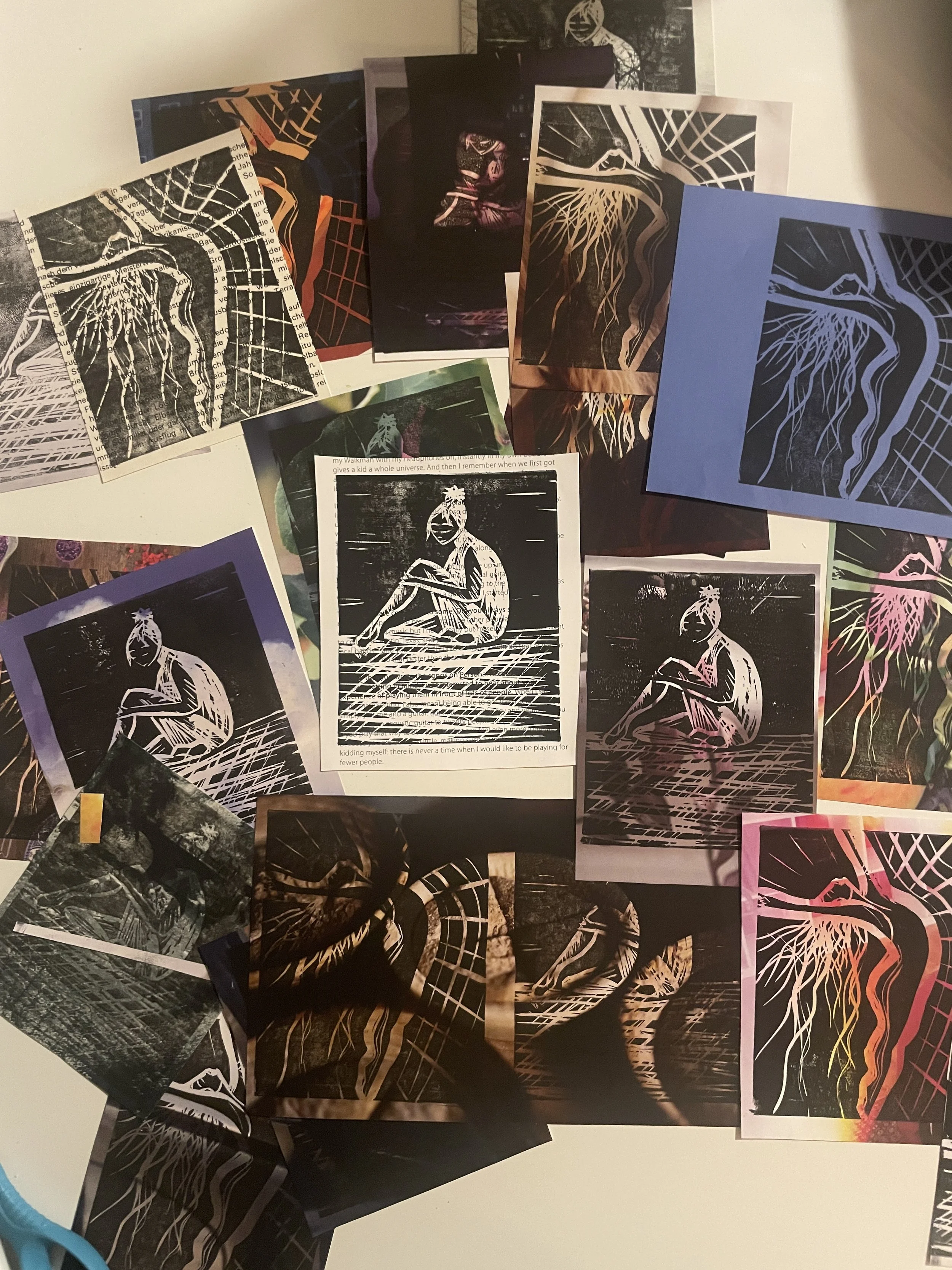 Collection of lino prints on magazine paper